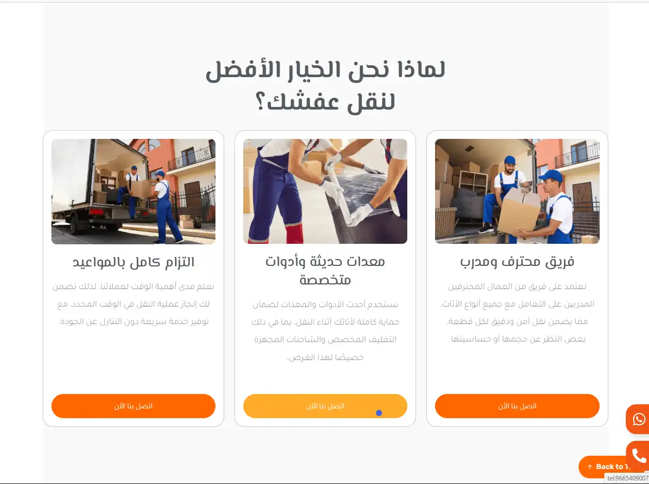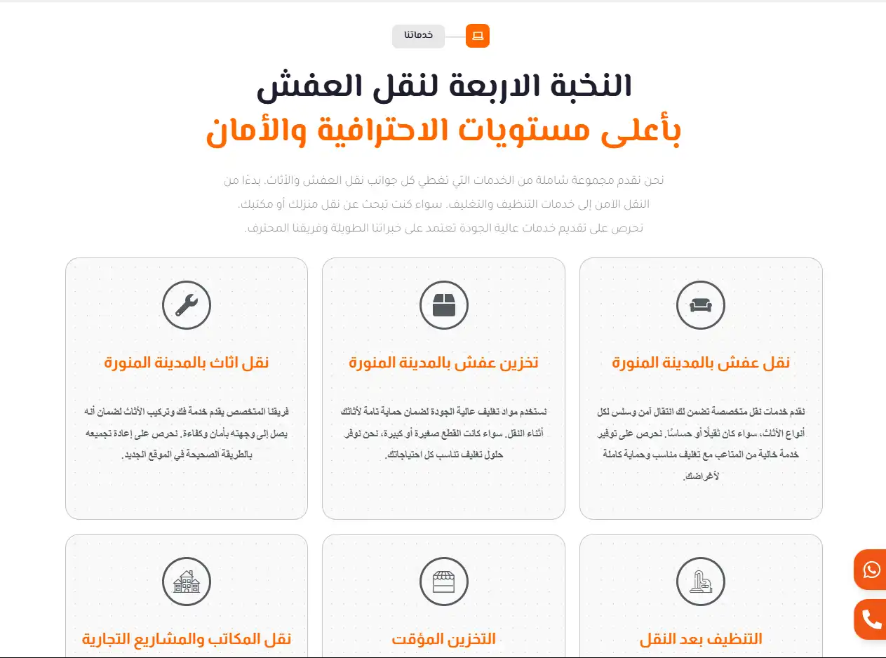 تم تهيئة الموقع لمحركات البحث (SEO) باستخدام كلمات مفتاحية مستهدفة مثل “نقل عفش المدينة المنورة” و”شركة نقل أثاث”، مما يساعد على زيادة الظهور في النتائج المحلية على جوجل وجذب المزيد من العملاء المحتملين.