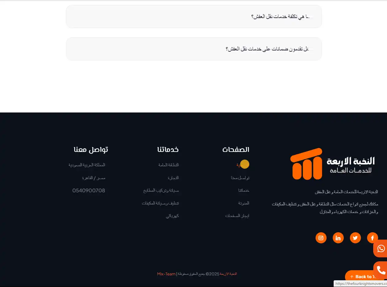 موقع شركة الفرسان الأربعة لنقل العفش تم تصميمه ليكون واجهة إلكترونية احترافية تعكس جودة الخدمة وموثوقية الشركة في مجال نقل الأثاث داخل المدينة المنورة. يعتمد الموقع على أسلوب عرض منظم وبسيط يمكّن العميل من التعرف على الخدمات بسرعة، ويشجعه على التواصل الفوري مع الشركة.