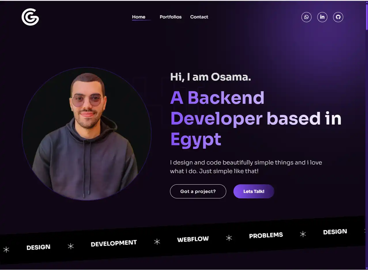 الواجهة الرئيسية للموقع صممت بعناية فائقة لتبرز هوية المبرمج بشكل مباشر، حيث يظهر اسمه بشكل واضح مع تعريف مختصر يعكس خبراته ومهاراته، متبوعًا بأزرار دعوة لاتخاذ إجراء مثل “تواصل معي” أو “اكتشف أعمالي”. تم استخدام تصميم داكن يعتمد على ألوان غامقة مع لمسات متباينة لإبراز الأجزاء المهمة.
