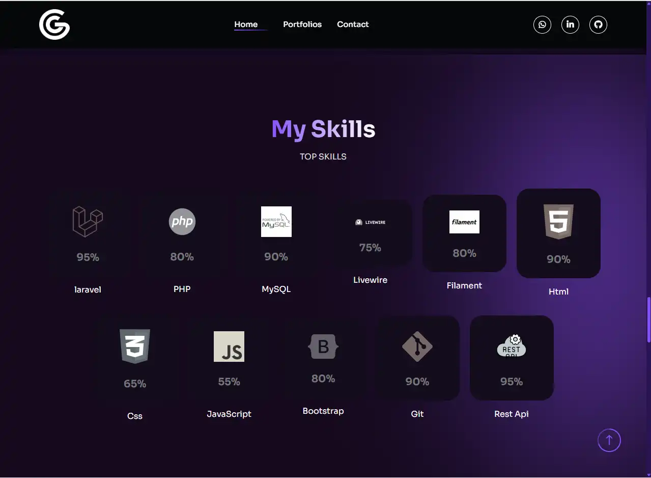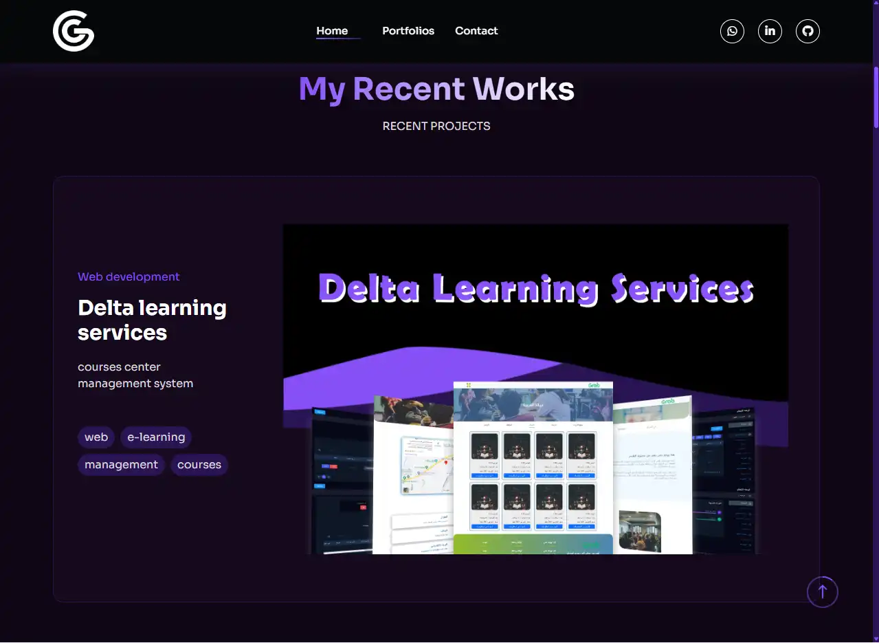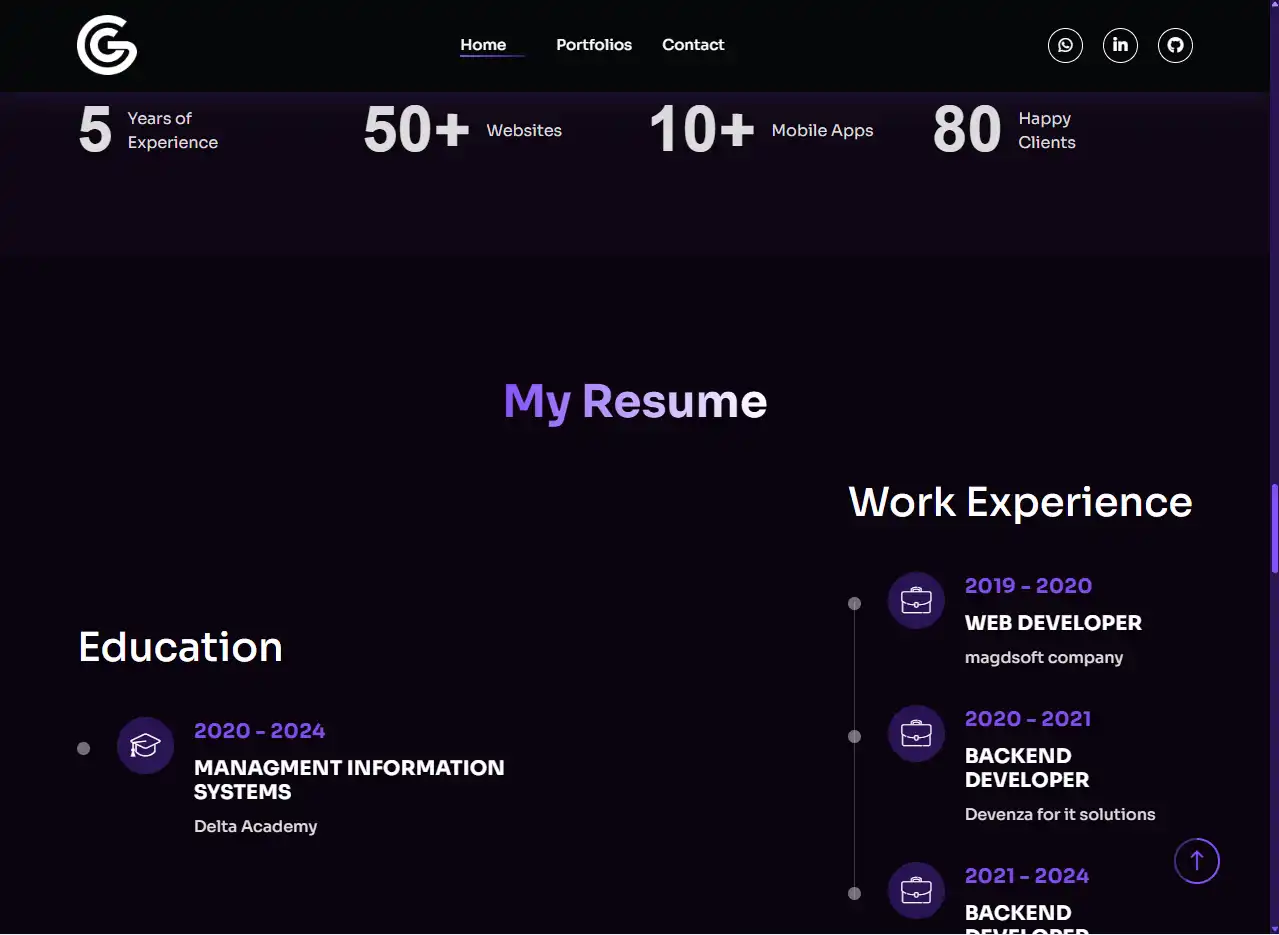 أحد الجوانب المميزة في الموقع هو قسم Portfolio الذي صُمم بطريقة جذابة تستعرض المشاريع بشكل يشبه بطاقات ديناميكية، يمكن للمستخدم التفاعل معها، مما يعكس مستوى الاحترافية ويبرز خبرات المبرمج بشكل مباشر.