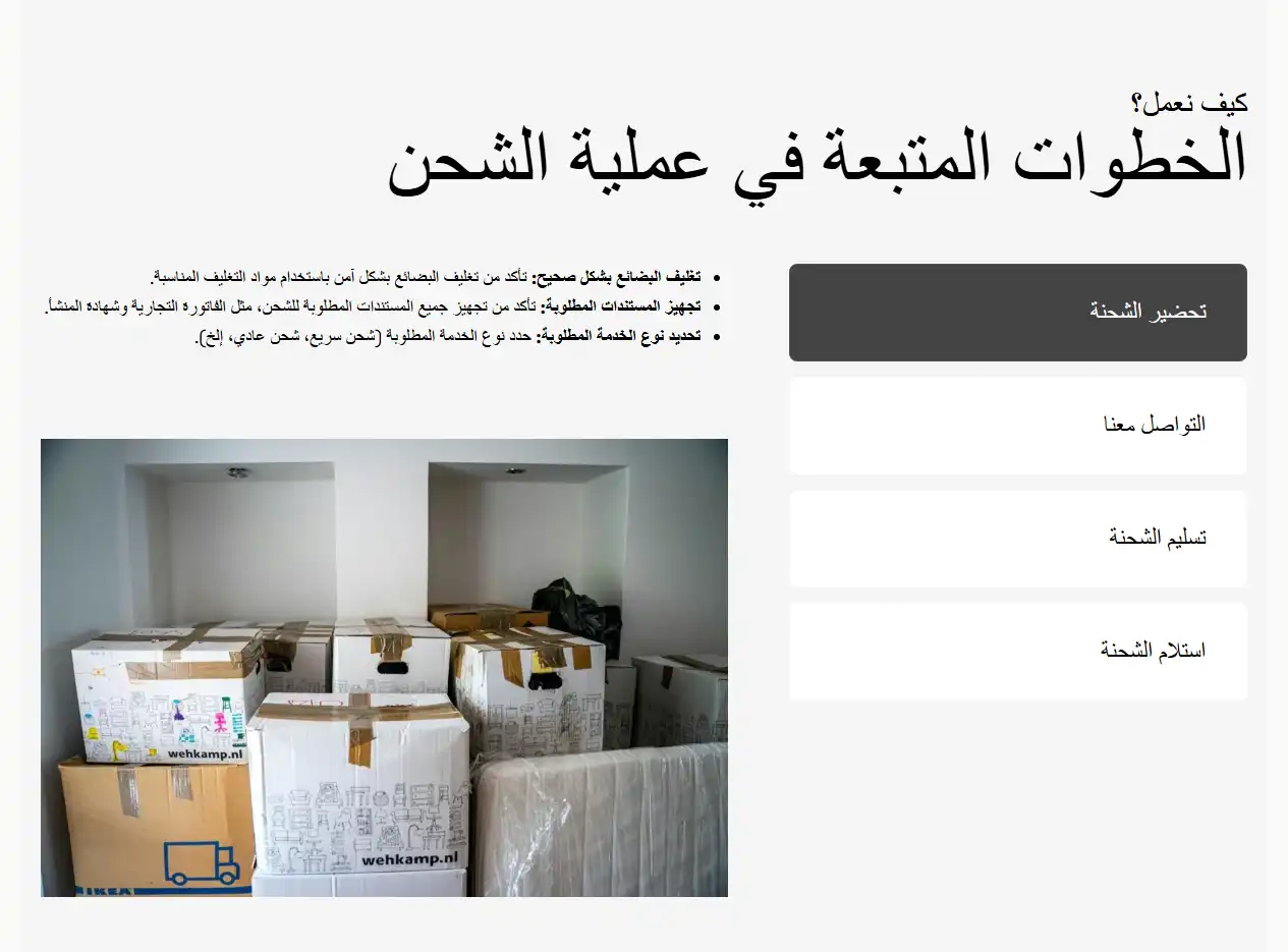 صفحة “عن الشركة” صُممت لتوثيق خبرة الشركة ومصداقيتها، بينما صفحة “الخدمات” و”تتبع الشحنة” تعزز الشعور بالأمان لدى العملاء. تم تحسين سرعة الموقع ليكون خفيفًا وسريع التصفح.